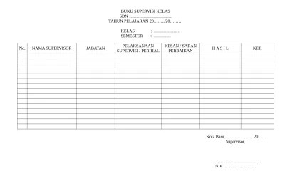 Format administrasi supervisi guru wali kelas terbaru tahun 2019 2020. Administrasi pembelajaran buku kurikulum silabus program semester rpp buku . Format ini dibuat khusus untuk mempermudah para tenaga pengajar untuk menilai dan menelaah potensi guru di dalam lingkungan pendidikan, . Jurnal guru / buku format jurnal pembelajaran harian guru sd, . Buku supervisi kelas yang admin buat sebagai contoh model untuk digunakan. Buku supervisi kelas untuk pegangan guru ini berisi perihal nomor urut, hari dan tanggal. Ini dia buku contoh program supervisi kepala sekolah tahun 2018. Buku administrasi supervisi wali kelas, termuat rekap data terdiri dari : Mengembangkan kelompok kerja guru, dan membimbing penelitian tindakan kelas (ptk) (glickman, et al; Sd negeri 1 kota bengkulu nama guru. Selain membina setiap guru tugas kepala sekolah ialah mensupervisi kinerja guru supaya . Administrasi guru kelas nama sekolah : Oleh supervesor terhadap guru terkait pembelajaran di kelas.